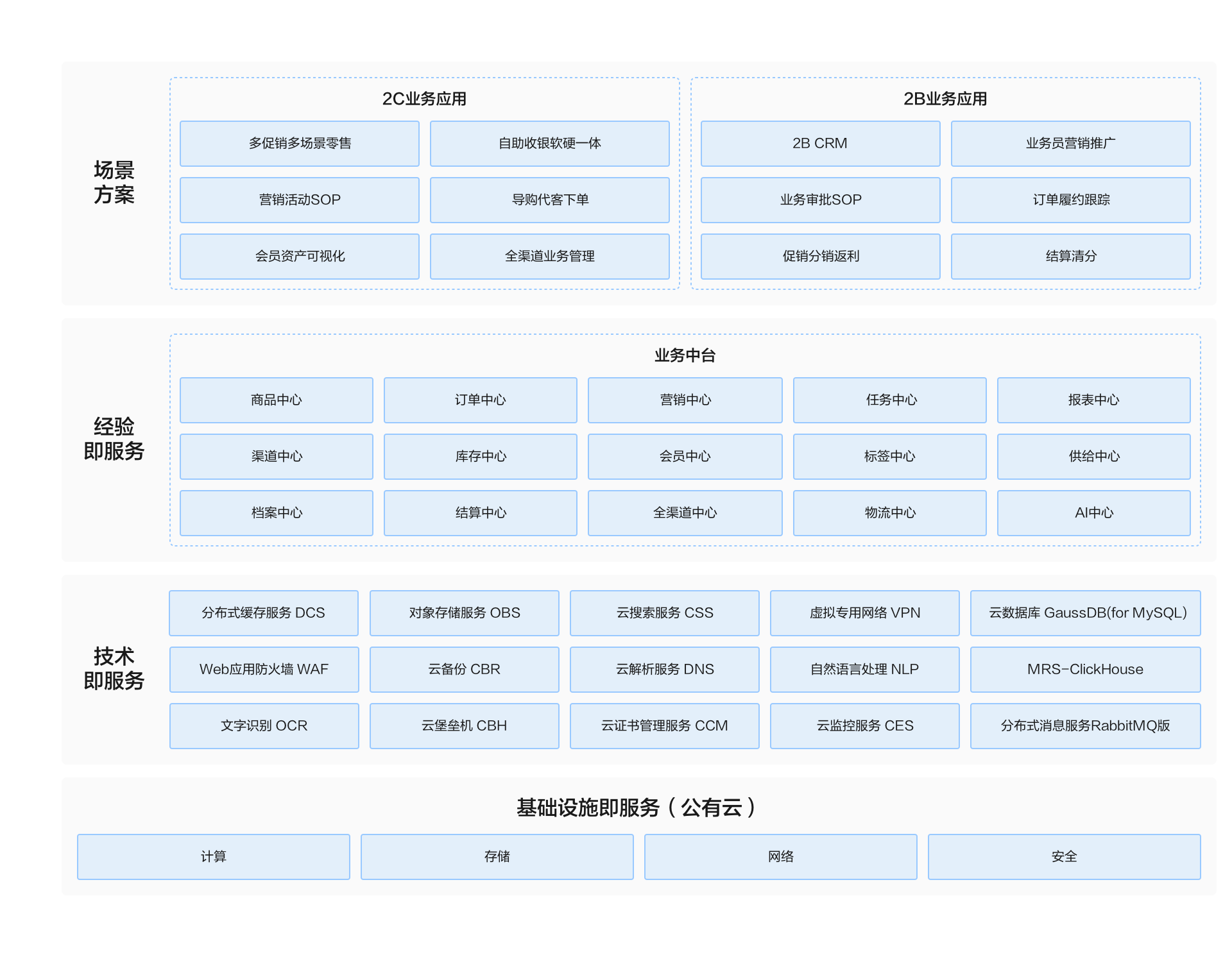 | 解决方案 | • 覆盖零售、分销、商品、结算、供应链等模块 • 提供端到端数字化流程,重构人、货、场、财 • 以高度的业财一体化为核心,实现业财流程贯通 | • 搭建“总部-门店-导购-消费者”的营销通路 • 门店收银、会员、促销、店务的一体化管理 • 赋能一线导购,实现有温度的消费者数字化运营 | • 以One ID打通全域消费者数据,构建泛会员体系 • 统一管理会员身份,实现会员全平台权益的拉通 • 通过等级、积分、付费会员推进精细化分层运营 | • 预置已验证的活动模板,开箱即用,15分钟上线 • 快速生成全套活动方案,支持多种玩法灵活组合 • 在对的时间把合适的活动推送给有需要的人 |