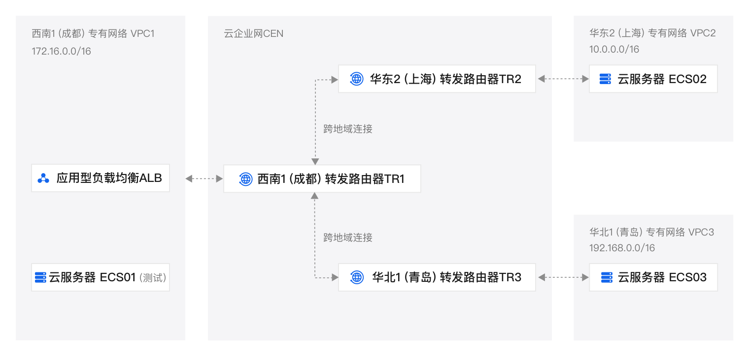 架构采用云企业网将不同地域内的云上网络资源联通形成内网,采用转发路由器实现跨地域互通,实现了各地域云服务器及应用型负载均衡的实例网络互通。通过在应用型负载均衡实例中挂载跨地域的云服务器,从而进行跨地域流量分发,实现了跨地域级别的应用高可用。