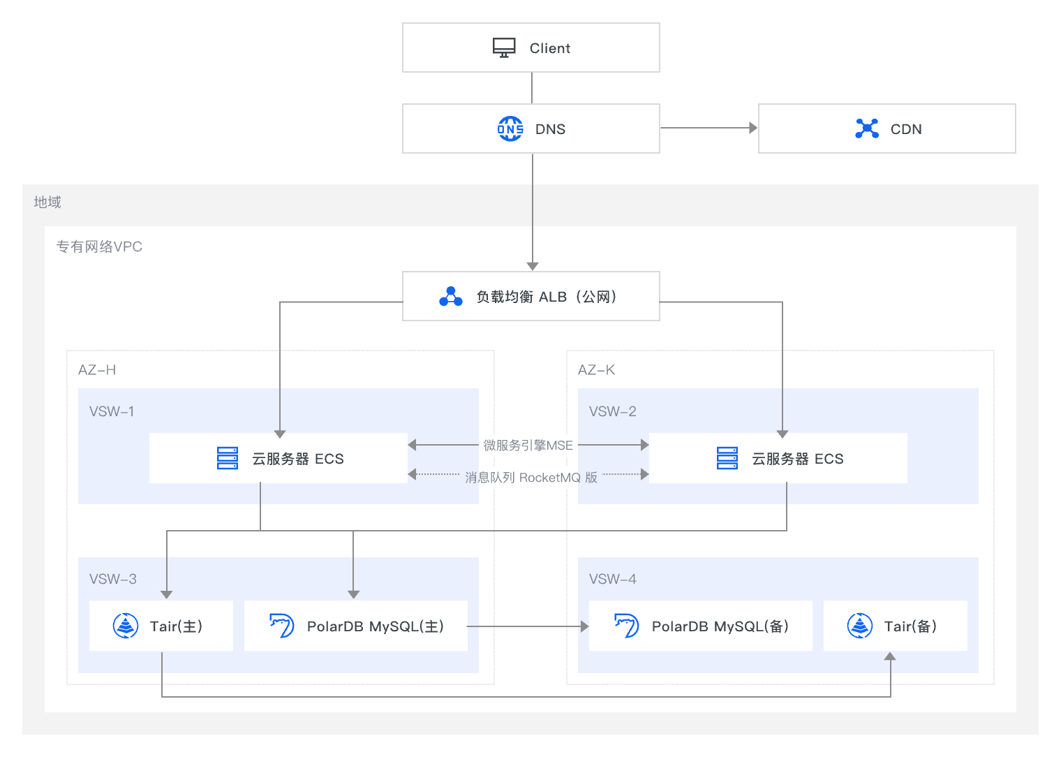 | 稳定 | 可靠性不足在遇到硬件故障或网络问题时恢复较慢。 | 稳定性高ALB和ECS通过多可用区部署均可实现99.995%的可用性,云数据库Tair达到99.99%。同时,PolarDB通过存储热备集群,提升多节点集群的可用性至99.99%。 |